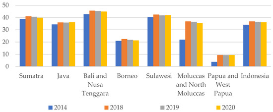 Since 2014, as shown in Table 3, all indicators have demonstrated a consistent declining trend across all Indonesian regions. Java had the lowest level of inequality, while Papua and West Papua had the greatest. Even though Papua and West Papua’s rural regions had the lowest RAI and the greatest inequality, this value had decreased. This trend is stronger in this region than in the others.