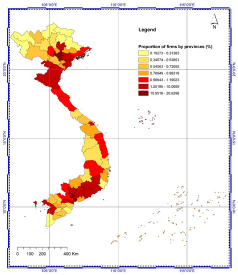 We used data from a large-scale nationally representative survey covering all 63 provinces, firm types, and firm sizes with a sample of 162,738 surveyed firms. The GSO responded to a request to provide prompt information as a basis for government intervention in April 2020 by implementing a national survey on the impact of COVID-19 on enterprises and business activities. Subsequently, the GSO conducted a second round of surveys in September 2020. This survey aims to gather information on the impact of COVID-19 on the production, business activities, and coping strategies of various enterprises. These findings will enable governments and policymakers to propose appropriate policies and solutions to assist businesses in better coping with the ongoing pandemic across all economic sectors and in a variety of regions. The scope of the survey included the entirety of the country, with operations in all economic sectors (Figure 1), with the exception of Communist Party activities and businesses related to security and defence. In addition, the survey collected essential firm information such as name, address, phone, fax, and email addresses as well as tax codes, economic types, and principal business activities. The survey asked respondents to rate the overall impact of the pandemic on their firm (either positive impact, negative impact, or no impact). The survey also asked respondents to rate the impacts on the availability of domestic raw materials, the domestic consumption market, and the export market. The survey further asked about the operating status (either currently open, temporarily closed, permanently closed, or bankrupt), revenue history, and whether the firm had received government support for COVID-19 relief. Finally, the survey asked respondents to report any coping strategies used.