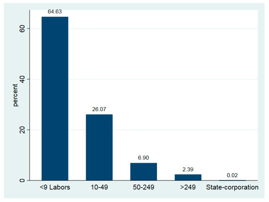The survey was conducted using an online voluntary method that was based on a web-based questionnaire. Companies that work in a variety of manufacturing industries, such as agriculture, mining, processing and manufacturing, construction, wholesale and retail, transportation and warehousing, accommodation and food services, information, finance and insurance, real estate, education, and healthcare, were the primary focus of the survey. It should be emphasized that small business households and SMEs account for the large majority, approximately 90%, of the 162,738 enterprises that took part in the survey (Figure 2).