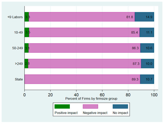 Figure 3 shows that the majority of the companies responding reported negative impacts as a result of the pandemic, with larger companies being more severely impacted. More specifically, large-scale businesses with more than 249 employees, accounting for approximately 7.8% of the sample, reported that they were heavily affected by the COVID-19 pandemic, accounting for 96.3% of the total sample. Additionally, it was confirmed that the pandemic had a negative impact on over 80% of businesses on the smaller side. This result contradicts the findings of Nordhagen et al. (2021), who investigated the impact of COVID-19 on micro-, small-, and medium-sized enterprises in the food industry across 17 countries and concluded that the youngest firms (i.e., those that had been operating for less than one year) with fewer employees were less likely to be severely impacted by the virus. In addition, many state-owned corporations, accounting for approximately 89% of the surveyed businesses, were negatively affected by the pandemic. It is important to note that no state-owned enterprises have benefited in any way from the COVID-19 pandemic.