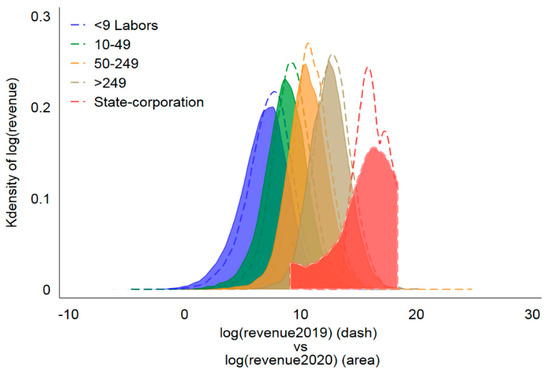 Figure 5 shows the results of the kernel density estimation comparing the distribution of revenue in 2019 (in Vietnamese Dong) to the distribution of revenue in 2020 for each firm size. When we compare the revenue of the company between the two years of interest, we find that their unconditional distributions will move further to the left by 2020. According to these findings, there are likely to be adverse effects on revenue in 2020 compared to 2019 (Figure 5). Consequently, the COVID-19 pandemic has had a detrimental impact on companies’ production and business activities. Figure 5 demonstrates how compliance with social distancing and government policies meant to combat the COVID-19 pandemic has impacted the majority of businesses. This finding is consistent with that of Brucal et al. (2021), who reported a decrease in sales of nearly 63% in South Asian businesses located in developing countries. Figure 5 also illustrates how the decrease in firm revenue caused by the COVID-19 outbreak varied according to firm size. According to our findings, the revenue of state-owned enterprises decreased most significantly among all business groups examined in this study. Lockdowns and social distancing are two examples of policies implemented by the government that have contributed to a negligible decline in revenue for businesses employing 50 people or more. In addition, businesses with 50 or more staff members continued to have a higher employee turnover rate than other groups.