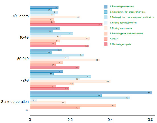 Figure 6 shows various ways in which different company groups dealt with the impact of the COVID-19 pandemic. In response to the pandemic, approximately 40% of the smaller companies with nine or fewer employees did not implement any strategy (Figure 6). Thirty percent of the market share was held by businesses that utilized the updated market search strategy but had fewer than nine employees. In the meantime, only ten percent of the businesses that were surveyed implemented additional strategies, such as promoting e-commerce, transforming products and service methods, training employees, and finding source input, and the “finding many new markets” strategy was applied by approximately 30% to 40% of large enterprises and SMEs, respectively, as a means of coping with the COVID-19 pandemic.