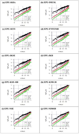 By employing MF-DCCA, we present a quantitative analysis of the non-linear properties in the cross-correlation of US EPU with conventional and Islamic stock markets. The fluctuation function , is calculated with increasing scaling order, and values are assigned to at intervals of , with a minimum value of −5 and a maximum of +5. The log–log trends of , which varies with time length are plotted in Figure 1 for the pairs of US EPU and the indices of Islamic and conventional stock markets. The scale order represented by the lines, which grow from bottom to top, range from −5 to +5. This indicates that a power law connection exists inside each of these pairs as exhibits an apparent rising trend with the progressive growth of with all scale orders.
