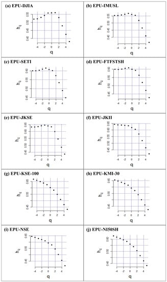 We compute the generalized Hurst exponent , which is one of the crucial inspection steps for the cross-correlation check between the US EPU and stock markets. Figure 2 shows the evolution pattern of the Hurst exponent, under variations in order −5 to +5. It is noted that all the pairs of US EPU’s Hurst exponent values show a changing pattern with rising scale order. For example, the values of for the pair of US EPU/DJUS gradually decrease from 0.52 at q = −5 to 0.56 at q = 0, and then drop to 0.38 at q = +5 (see Table 3). Similar patterns can be seen in other US EPU pairs with sampled stock markets.