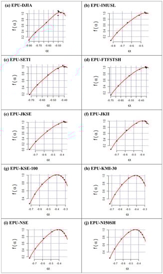 Finally, in order to increase the robustness of multifractality, we perform a singularity spectrum analysis. The Legendre transformation allowed for the acquisition and presentation of the singularity spectrum , based on the participation of the Hölder exponent and the Rényi exponent , could be, respectively, obtained as
