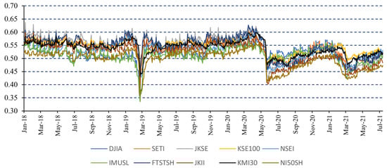 Table 2 shows the descriptive statistics of US EPU along with Islamic and conventional market indices. The highest mean return in the entire data set, is observed for US EPU which is 16.12%, while SETI, FTSTSH, and JKII show the lowest average return of 0.00%. The markets of DJIA, NSE, and IMUSL show the same average returns of 0.07%. Interestingly, the highest maximum return in a day (19.53%) and the highest daily loss (16.08%) are both observed for NI50SH Indian Islamic market. Similarly, NI50SH is seen to be the most volatile among all considered markets. All series’ skewness values are negative, except for JKSE, JKII, NI50SH and US EPU. All market values have kurtosis levels greater than three, indicating that these markets share the stylized facts of fat tails.