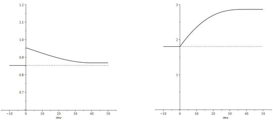 - For the rest, i.e., on the interval , the dynamic is given by Equations (10a)–(10c) with and . The boundary conditions arewhereThe solution is given by the consumption rate,and the loan valueNote that is a function of several parameters and is a constant.