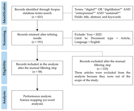 The search was performed on 11 April 2022, using as keywords “digital*” OR “digiti$ation” AND “entrepreneur*” AND “sustainab*” in three alternative fields: title, abstract, and keywords. These keywords were defined based on previous studies (e.g., Anand et al. 2021; Fernandes et al. 2022; Kraus et al. 2019). We used an asterisk for our search to ensure we did not leave out any publications of interest, since an asterisk can substitute for the absence of a character, a single character, or multiple characters in a word. For instance, “entrepreneur*” can be entrepreneur, entrepreneurs, entrepreneurial, and entrepreneurship. We also used the symbol “$” to substitute different characters. Thus, “digiti$ation” can be digitization and digitisation. In this step, the query search resulted in 431 publications. Then, according to the previous literature, we limited the sample to articles written in English and published in international journals (Anand et al. 2021; Kraus et al. 2019, 2020). No start date was specified, enabling the search engine to detect the earliest articles in the research field. As we are in 2022, we limited our search to articles published (online) up to 2021. This reduced the number of publications to 191 articles.
