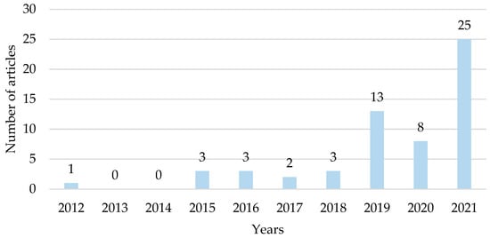 Figure 2 displays the number of articles published on DE and sustainability between 2012 and 2021. The growing interest in this research field began to develop over the last decade, with some evident progress after 2018, suggesting that this subject has been gaining popularity in the academic community in the last years. In fact, the scientific literature on DE is recent (Fernandes et al. 2022) and, thus, the same is true regarding DE and sustainability. As can be seen in Figure 2, 2021 was the most productive year, with 25 articles.