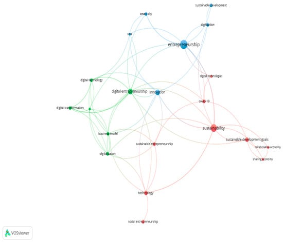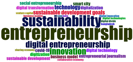 Figure 3 shows the frequently occurring words in the author keywords of the articles analyzed, indicating the thematic focus in these studies. The most prevalent keywords are entrepreneurship, sustainability, digital entrepreneurship, innovation, sustainable development goals, and digital technology.
