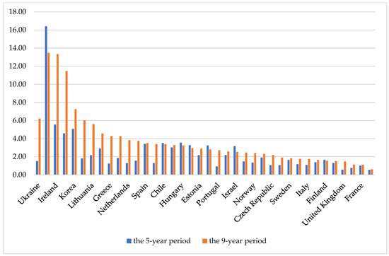 - The coefficients of variation (Formula (5))CV = σ(tax to GDP ratio)/Tax to GDP ratioaverCV—the coefficient of variation of the tax to GDP ratio, σ (tax to GDP ratio)—standard deviation of the tax to GDP ratio, Tax to GDP ratioaver—arithmetic mean of the tax to GDP ratio.