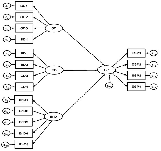 The structural and measurement equation of the model. Independent variables (IV): SD: stands for the social drivers, ED: Economics drivers, EnD: environmental drivers, Dependent Variable (DV): SP: sustainability performance.