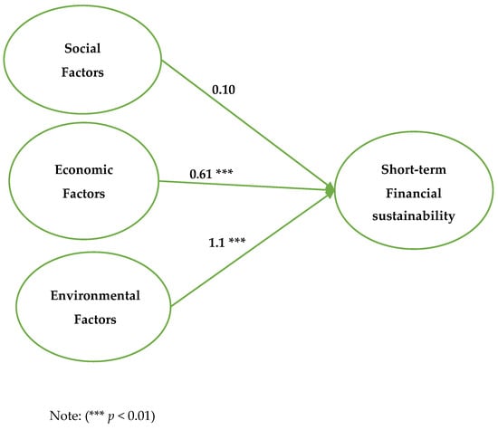 Figure 3 shows the e impact of the social, economic, and environmental drivers of green finance on the Palestinian banks’ short-term financial sustainability. Based on the data, the model does not indicate a significant impact of social factors on short-term financial sustainability.