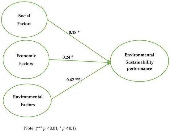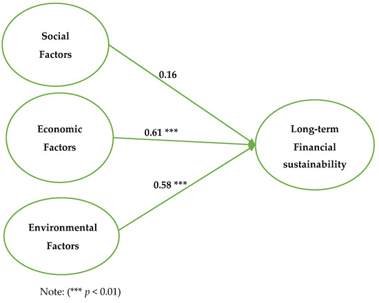 Figure 4 shows the impact of the social, economic, and environmental drivers of green finance on the Palestinian banks’ long-term financial sustainability. The model does not indicate a significant impact of social factors on long-term financial sustainability.