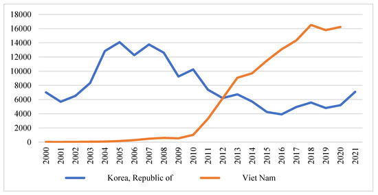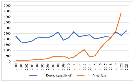 Korea and Vietnam ICT exports to the EU 2000–2021, USD million. Source: constructed by authors based on (UNCTADstat n.d.).