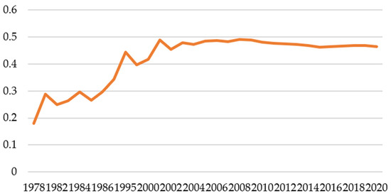 The Gini coefficient ranges from 0 to 1. A numerical value that approaches 1 expresses a wider income gap, and a numerical value that approaches 0 shows higher income equality. The United Nations Development Programme stated that if the Gini coefficient of a country exceeds 0.4, it indicates that the country’s income gap is serious, and the country needs to take urgent action to address this gap. Figure 1 shows the Gini coefficient in China from 1978 to 2020. In 1995, China’s Gini coefficient rose to 0.445 for the first time. Beyond the warning line of 0.4, the income gap starts to become a problem that must receive great attention in the evolution of China’s economic growth. Since the beginning of the 21st century, China’s economy has taken off, but income disparity still remains high. In 2008, it reached a peak of 0.491, which is close to the point where the income gap is particularly large. In 2020, the Gini coefficient scored as high as 0.465, indicating that income disparity in that year was very large. Therefore, China urgently needs to address this excessive income disparity.