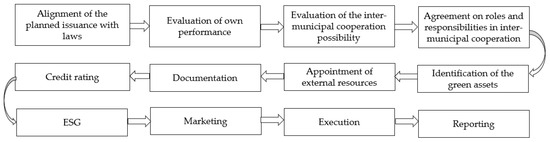 The final step of the proposed research is to develop a decision-making algorithm for the issuance of green bonds by municipalities in inter-municipal cooperation in Lithuania. The visual representation of the algorithm is provided in Figure 3, with the corresponding steps.