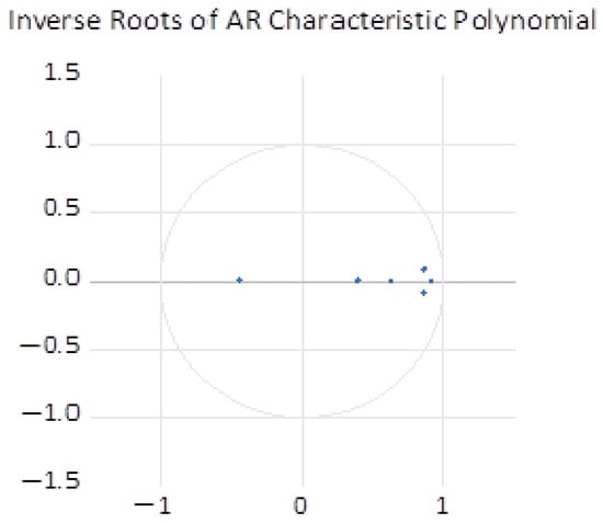 The first step was to find the optimal lags of the VAR model. These were selected using the Akaike information criterion (AIC), likelihood ratio (LR) test statistic, the final prediction errors, Schwarz information criterion (SC), and Hannan–Quin (HQ) information criterion. As shown in Table 4, the optimal lag corresponds to lower values for these criteria. Hence, a lag equal to 1 was selected.