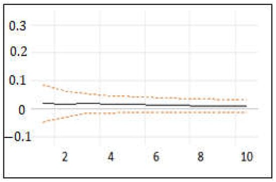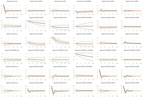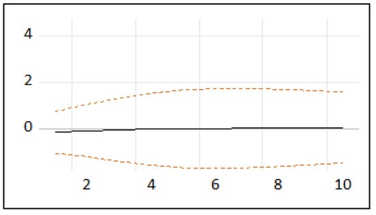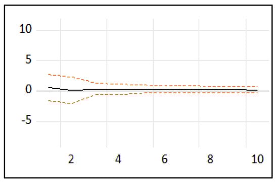 The impulse function for the uncertainty–informality relationship shown in Figure 9 illustrates that an uncertainty shock leads to a slight decrease in informal sector transactions. Economic and social stability leads households to become market speculators. These few speculators operate in the parallel certainty market and escape unfavourable state policies without needing an uncertain context. Likewise, according to Figure 10, the response of uncertainty to an informality shock is negative. In other words, the informal economy reduces uncertainty. Once informal speculators emerge in parallel markets, they no longer need policy uncertainty. On the contrary, they try to become part of the formal market.