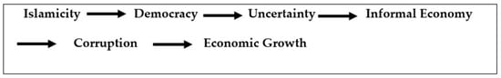 The chain reaction illustrated in Figure 3 shows that Islamicity has an effect on democracy, democracy on uncertainty, uncertainty on the informal economy, the informal economy on corruption, and corruption on economic growth. The relationships between these factors are described in Section 4. However, in this section, we discuss all variables together to confirm the contagion effect.