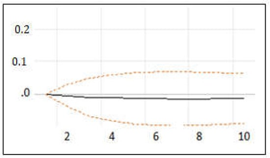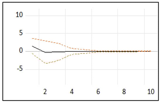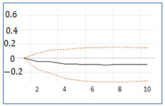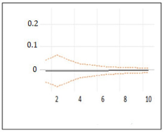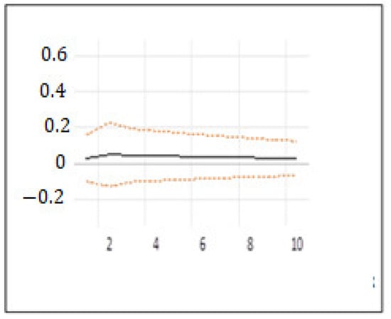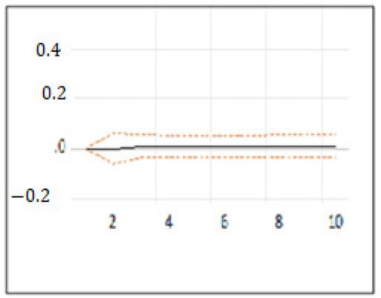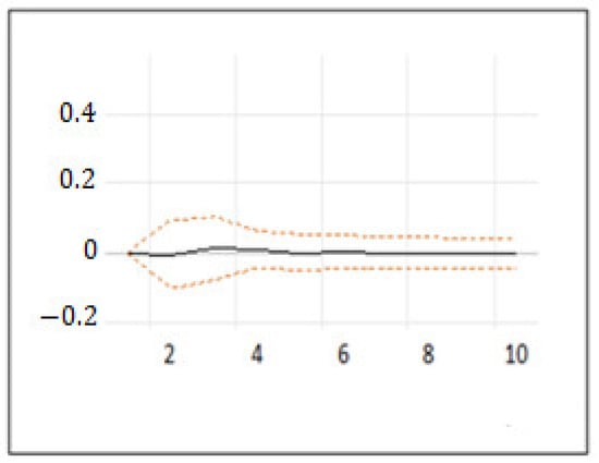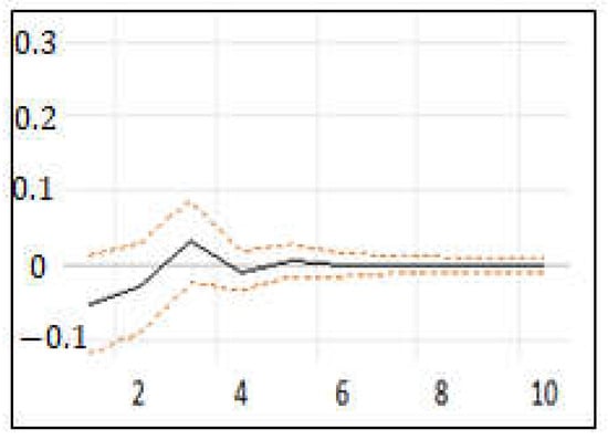 All values of the modulus were greater than 1. Referring to the graph, we can observe that all the dots are inside the circle. Therefore, we concluded that our VAR model satisfied the stability criteria. However, the estimation of the VAR model did not offer insights into financial significance. Therefore, we constructed an impulse function to investigate the response of each variable to shocks, as shown in Figure 2.