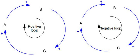 The plus and minus signs in the figure indicate the polarity of the causal link: a positive (+) polarity means that an increase (decrease) in one variable will result in an increase (decrease) in the other variable. On the other hand, a negative (−) polarity means that an increase (decrease) in one variable will result in a decrease (increase) in the other variable. These simple structures form feedback loops that give rise to the system’s behavior. For example, Figure 2 (left) illustrates a typical positive feedback loop: an increase in the value of variable A will result in an increase in the value of variable B, which will increase the value of variable C. However, variable C affects variable A, hence its increase will result in a further increase in variable A. Thus, a positive feedback loop causes an exponential increase (or decrease) in a system. On the other hand, a negative feedback loop brings the system to a balance.