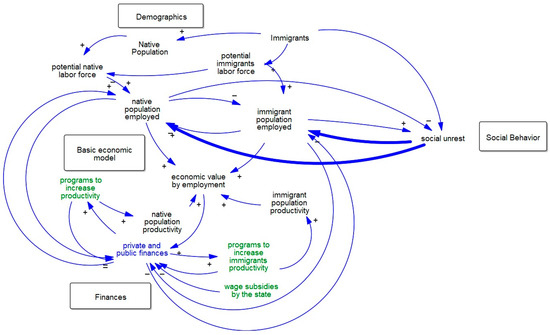 The other sector of the model was a generic economic model. Both the native and immigrant population increased the demand for products, which increased the labor demand of businesses. These businesses could find labor in either the native or the immigrant population and create value for the entire country. The employees generated products through their productivity and were paid through wages. The generated products were those that satisfied the aggregate demand. Consequently, the economic sector of the submodel did not explicitly take into account employees’ mobility (the shift in labor according to skills), and it was assumed that natives and immigrants were doing the same jobs. Further assumptions included the fact that no other sector of the economy was modeled, thus any employment/unemployment in the simulated country originated only from private businesses that produced a generic product. Finally, the demand for that product was not affected by external factors such as market dynamics, energy dependencies, etc.