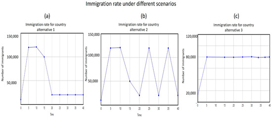 Regarding the “immigration rate for country” variable, it was represented as a time series variable with the purpose of depicting different scenarios for the inflow of immigrants. Figure 4 below illustrates the shape of these series. Figure 4a is meant to represent an initial surge of immigrants for a certain period and a subsequent decrease to “normal values”, Figure 4b represents different surges at different points in the simulation time, and Figure 4c represents a constant inflow of a high number of immigrants for the majority of the simulation time.