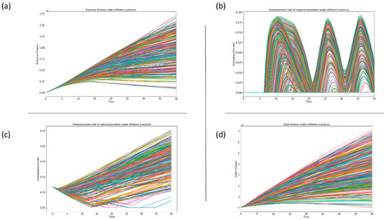 The results for the business finances, unemployment rate of the immigrant population, unemployment rate of the native population, and state finances of the different scenarios are illustrated in Figure 5a–d, respectively.