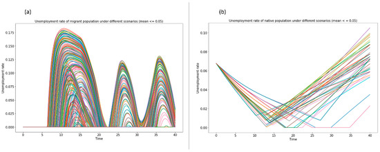 To obtain better insights into how the unemployment rates of both the native and immigrant populations behaved during the simulation time, the scenarios were sampled and only those in which the unemployment rates had a mean lower than 0.05 for the simulation time were kept. The simulated results, which are shown in Figure 6, indicated that there were far fewer scenarios in which the unemployment rate of the native population was at lower levels than those of the rate of the immigrant population.