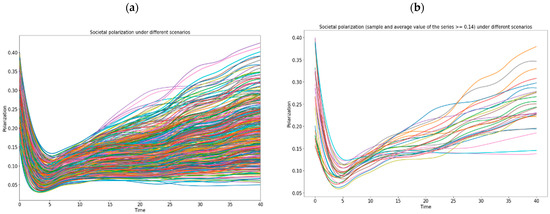 Societal polarization: (a) all scenarios; (b) scenarios with a mean series value above 0.14.