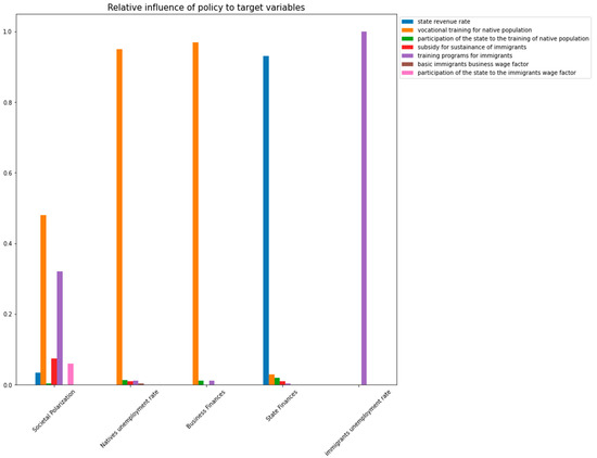 The results of the boosting regression algorithm are depicted in Figure 8. For societal polarization, the most influential variables were the “vocational training for native population” and “training programs for immigrants”, while there was only a small influence by all the other policy variables. On the contrary, all other target variables were influenced for the largest part by one variable: “vocational training for native population”. This was not unexpected because extra vocational training resulted in higher productivity, thus there were more opportunities for employment for the native population and more opportunities for revenues for the businesses. “State finances” were influenced by the “State revenue rate”, which was not unexpected; however, this revealed an important insight into any potential public–private cooperation: it will have no discernible effect on the state finances as long as there is a robust taxation regime. Finally, the “immigrants’ unemployment rate” was influenced by the “training programs for immigrants”, which indicated that any path toward integration must pass through training and vocational programs in order to increase the productivity and employability perspectives of the immigrant population.
