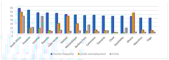 Over the past decades, the prevalence of criminal activity in Africa has skyrocketed, becoming a major social problem impeding the region’s development. As economies transition from traditional to contemporary ways of living in order to experience socioeconomic and cultural changes, it is predicted that changes in criminal activities will occur. At the same time, this region is suffering from a high level of unemployment, income inequality, and low growth. This poses a question: Is a worsening labor market a breeding ground for crime? Does having a legitimate job reduce one’s willingness to offend? Does the worsening of income inequality necessarily lead to crime? These basic questions are ubiquitous throughout the developing world, and policymakers must consider first reference theory for help. As mentioned earlier, African countries suffer from a number of issues, such as high levels of unemployment and income inequality, with high crime rates. Figure 1 graphically demonstrates the mean Gini coefficient, youth unemployment, and crime covering the period (1994–2019) for 15 African countries.