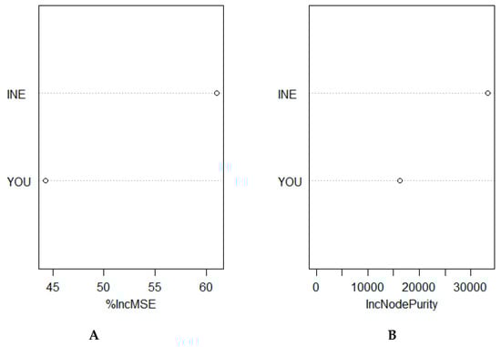 The Pedroni cointegration test and the three cross-sectional reliance tests all strongly reject the null hypothesis of no cointegration and cross-sectional reliance in variables. We further adopt the machine learning developed by (), using the random forest (RF) in this study in order to find the variable that has the highest contribution to crime between income inequality and youth unemployment. We believe this will assist policy-makers in understanding the significant contributor of crime in these countries between the two current issues. We set the number of trees within the RF to 2500 in order to make a prediction of the RF more precisely. The results of the RF are reported in Figure 2, while Table 3 translates the results into percentage format. The first chart on the left-hand side, represented by A, reveals mean decrease accuracy (“%incMSE” test), which tests how poorly the model performs without each variable. The second graph on the right-hand side, denoted by B, reveals the nodes (IncNodePurity), which aims to measure how pure the nodes are at the end of the tree without each variable.