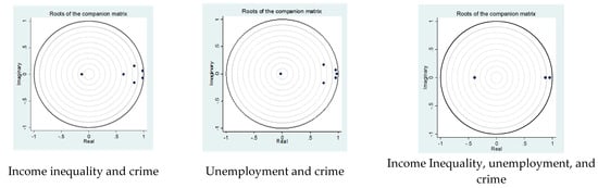 Lag length selection is a normal approach in a VAR model before predicting a PVAR. To calculate the lag length, the unconstrained PVAR is estimated with all variables in levels and a maximum number of lags of seven, then lowered by re-estimating the model with one lag fewer at a time until zero (). The values of the Akaike information criterion (AIC) and the Schwarz information criterion (SIC), as well as their corresponding autocorrelations, heteroskedasticity, and normality diagnostics, are examined in each of these models, and the model with the shortest lag duration is chosen. Considering ’s () guidelines for restricted observations, such as those used in this work, the maximum number of lags was originally set at seven and gradually dropped to two, which met the Gaussian criteria. Table A2 in Appendix A shows the findings for the optimal number of delays. When estimating the panel VAR model using various data transformations, the second lag appears to be more stable and consistent. The models were estimated after the quality of the data was tested. However, we began by testing the model’s stability using autoregressive (AR) roots for all PVAR models. We discovered that no roots were located beyond the unit circle in any channel, indicating that the stability criterion was met, as shown in Figure 3.