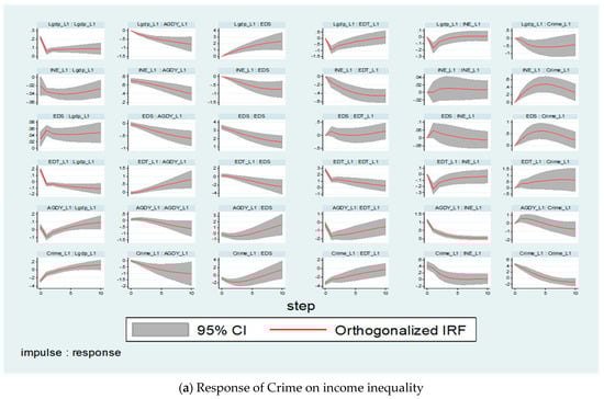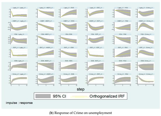 We then estimate the second model in finding the dynamic shock of youth unemployment on crime in African countries. In the last row of Figure 4b, a shock of 1% standard deviation to young unemployment (YOU) subsequently had a 10% positive impact on crime from period zero to period six. This then converged to a negative value but remained above the steady-state zone before reverting to the steady-state region. The impulsive reaction indicates that an unexpected shock has a long-term favorable influence on YOU. The possible reason for the positive impact of youth unemployment on crime is related to the fact that being unemployed may make individuals frustrated, which in turn may lead to violent crime, as scholars argue that criminality is an outcome of social interactions. Thus, if the unemployment rate increases, it may create a criminal culture within some groups of society. People who earn low salaries are more prone to conduct property crimes such as burglary since they will make money even if it is illegal. Because money is the major motivator, assault, and robbery are also linked to high unemployment rates. Poverty and a lack of resources exacerbate crime. We also estimate the simultaneous impact of shocks of income inequality and unemployment on crime by including three variables in our model, as shown in Figure A1 in Appendix A. The results of the simultaneous impact of these variables further support the results reported in the baseline model. Furthermore, our findings support the findings reported by () using panel data from the US, () focusing on the southern African provinces, particularly KwaZulu-Natal, () for some countries in Europe, () for a panel of 28 European Union countries; and () for New York State.