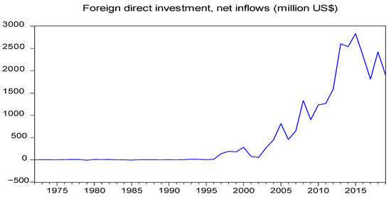 FDI net inflows (million USD) in Bangladesh (1972–2019). Source: WDI (2021).