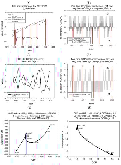 Lead-lag relations between GDP, employment (EM), and unemployment, (UE). (a) GDP and EM, both LOESS(0.1) smoothed. Drop lines show NBER recession. (b) LL relations between GDP and EM, both LOESS(0.1) smoothed (gray) and both raw, unsmoothed (dark gray). Numbers show percentage “pseudo significant” LL relations (see text). Drop-lines show the beginning of recessions. OLR between gray and black bars give R = 0.30, p < 0.001. (c) GDP-LOESS (0.8) residual and UE (%) both series LOESS(0.1) smoothed. (d) LL(GDP LOESS (0.8) residual, UE), both series LOESS(0.1) smoothed and normalized to unit standard deviation. Red horizontal lines show recession periods. Droplines show beginning of recessions. (e) Phase plot for GDP and EM, not detrended, 1989-1993M4, dropline show the beginning of the 1990 recession. (f) Same as (e), but with GDP and UE.
