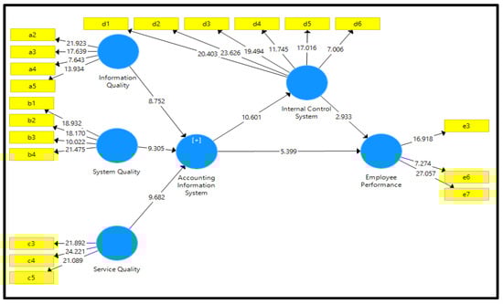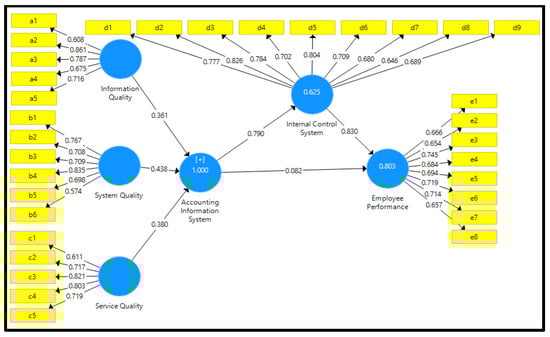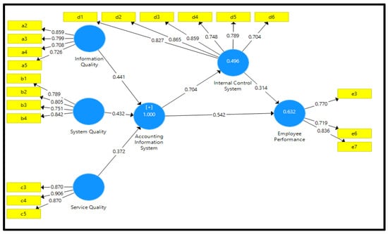 Our aim was to investigate the impact of the AIS (including IQ, SQ1, and SQ2) on EP in Jordanian banks, as well as the mediating effect of the ICS on the relationship between AIS and EP. A questionnaire was developed based on previous studies related to the subject of the study. The administered questionnaire consists of four parts that were tailored to the topic of the current investigation. The first section includes the employees’ demographics (gender, qualification, and experience), the second section contains 16 AIS components as independent variables, each represented by three variables (five items to measure the IQ from a1 to a5, six items to measure the SQ1 from b1 to b6, and five items to measure the SQ2, from c1 to c5). In addition, the third section includes nine items to measure the ICS from d1 to d9, and the fourth section contains eight items to measure the EP from e1 to e8, where the first stage investigates variable reliability and validity and the second assesses hypotheses. This is shown in Table 1.
