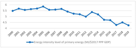 The case of Malaysia is no different on the frontier of decelerating energy consumption, as can be seen in Figure 4. The trend of energy intensity, which measures the level of energy necessary for the production of one unit of output relative to the GDP, has been on a downtrend in recent years, indicating a decreasing reliance on energy or the increase in energy consumption efficiency for both industrial and household consumption. This downtrend holds large significance in the consumption of energy based on sources from both the global and national level. As coal and natural gases hold the biggest shares in energy consumption and production, the downtrend in energy consumption is majorly contributory to the reduction in reliance on these two nonrenewable sources and an indication of a gradual shift towards other energy sources for commercial and household consumption. In the discourse of sustainability, these data solidify the growing attention this subject matter holds and the need for further investigation into it, as well as the further growth in efficiency when paired with the current economic trend—the digital economy. All the data above take into account the morphing economic environment, where the digitalization process is reflected in terms of promoting production efficiency.