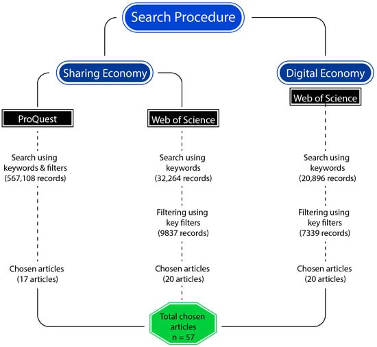 Given that the paper is intended as a study on the DE and SE from a more macroanalytical overview, the first stage of the data collection applied the search keywords “Sharing Economy” and “Digital Economy” in its preliminary search stage. These keywords were applied on both of the aforementioned literature databases to ensure consistency in the search procedure. As a result of this stage of data curation, the number of results was overwhelming, which incited the need for the keywords to be paired with dedicated filters for the elimination of irrelevant search results. The filters applied in the Web of Science and ProQuest databases differed based on the database’s interface and search options. The filters and filtering process are simplified, as shown in Figure 6 and Table 1, where the number of articles is whittled down from a population size to a sample size of 57 articles to be reviewed.