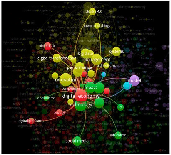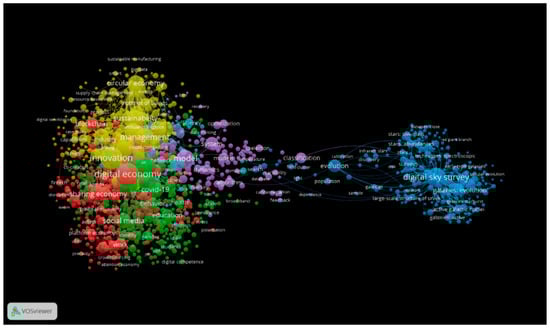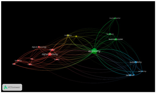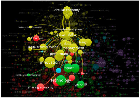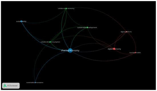 Zooming in on the relevant clusters from the Co-occurrence network visualization based on the n = 20,896 sample size, there are three main clusters of interest to this study, as mentioned earlier, which revolve around the digital economy, sharing economy and sustainability, as noted by the designated prominent colors of those clusters. While the general co-occurrence network visualization of Figure 6 shows the existence of these terminologies within the same environment with their respective degrees of interconnectedness, the purpose of zooming into each term or phrase of interest is to reveal the specific and closest relationships of it towards other terms. The digital technologically influenced economies are noted with a red accent in their cluster, whereas the aspect of sustainability is noted with a yellow accent in its cluster, as seen in Figure 7, Figure 8 and Figure 9. A prominent takeaway is the relationship among the terms, as well as the relationship between the terms and their surrounding terms. It can be observed that the SE and DE are often discussed in relation to sustainability and vice versa, based on the existence of the network and size of terms’ bubbles in Figure 10. There is an additional cluster of interest which most prominently encompasses technology and the COVID-19 pandemic. The links of these areas are commonly seen as drivers of the rapid digital growth over the last few years, giving way to the development of the digital economy, sharing economy and sustainable development.