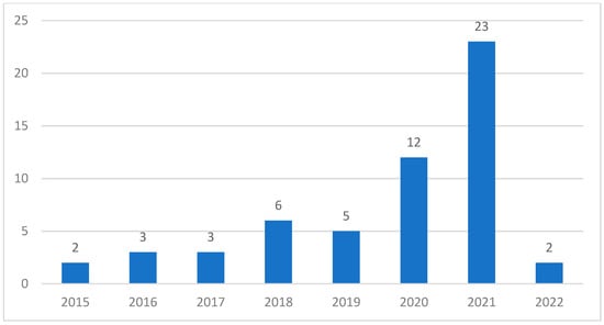 Looking at the information of volume of publications from the chosen sample of literature to be reviewed in this study, the trend of publication can be observed in Figure 15. The earliest publication among the stringently chosen articles for the purposes of the literature mapping is seen to be 2015. With a gradual and fluctuating increase in publications from the year 2015 to 2018, the volume of publications with respect to the digital and sharing economy surged significantly starting in the year 2018. While 2019 saw a slight decrease as compared with the previous year, it still saw a significant jump in volume of research within the scrutinized fields. The drastic increase could be interpreted as rising awareness of and attention to the digitalization of the global economy, as well as any subsets of research areas relevant to these new forms of economy. This spotlight shone on the matters of digitalization and sustainable development within a short time frame shows the severity and need for attention and response by the global and respective domestic economies. The publications in the year of 2022 are low, as this study was conducted in the first half of 2022, up to the month of June where, presently, the volume of literature on these subject areas is still growing. For the literature to reflect the current environment, it is held at the mercy of the release of data, which can often prove run against the urgency of publishing a study.