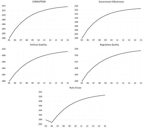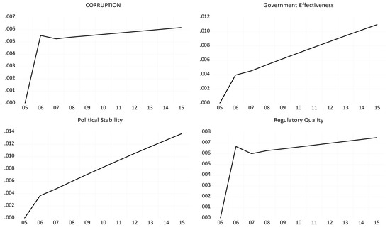 We then went on to estimate a five-variable VECM involving corruption, government effectiveness, political stability, regulatory quality, and the rule of law; however, we did not include voice and accountability as the bivariate model performed so poorly. All the long-run coefficients were significant, as were the adjustment coefficients. However, for space reasons, we will not report these results as they add little to the analysis.