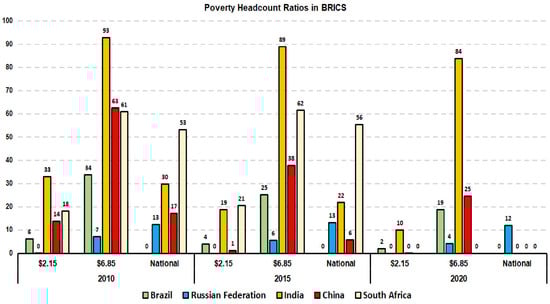 The poverty lines imposed by the World Bank (USD 2.15 and USD 6.85) and the national headcount ratio (typically evaluated by a country’s statistical agency) are illustrated in Figure 4. This shows the percentage of people below the specific poverty lines; for instance, India has the highest levels among the BRICS4 in the years examined, based on World Bank’s poverty lines. More specifically, around the years 2010, 2015, and 2020, the Indian population that lived under the poverty line of USD 6.85 (2017 PPP) was 93%, 89%, and 84%, respectively. Apparently, there is a great reduction in poverty rates, but this reduction remains far from any desirable target of eradicating poverty.