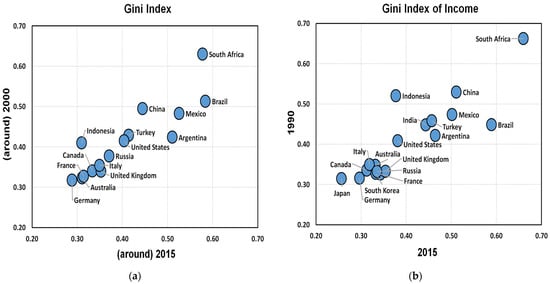 Most countries fall below extreme inequality in the Gini index, which is typically at the level of 0.5. Mexico, Brazil, and South Africa had inequalities of over 0.5 in both 2000 and 2015, as shown in Figure 7a, whereas in Figure 7b, between 1990 and 2015, Indonesia, China, Brazil, and, marginally, Mexico were above 0.5. Most importantly, South Africa had about 0.7 in the Gini index over these years, reaching the highest inequality among the G20.