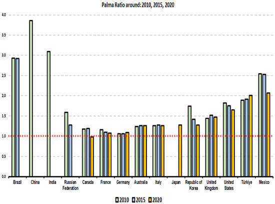 Palma ration in G20 countries in 2010, 2015, and 2020. Source: The figure was produced by the authors relying on data from OECD (2022).