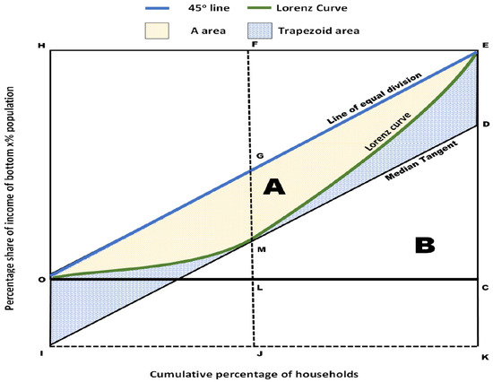 The Gini coefficient was introduced by the Italian statistician Corrado Gini (Cobham and Sumner 2013; OECD 2016; Ceriani and Verme 2012) and can be computed in Figure 6 as the ratio of two areas, firstly with the nominator as the area between the line of equality and Lorenz curve (symbolized as A), and secondly with denominator as the area below the line of equality (symbolized as A + B). It is characteristic that the tangent of the Lorenz curve at point J is of great importance as it provides information on the poor people if it is compared with the OD poverty (red dotted) line. In more detail, the relation of the area OJI to the area OKH denotes the ‘poverty measure’, in which OK reflects ‘the number of the poor’ (Sen 1976).