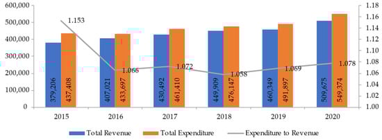 Since the effects of the financial crisis of 2008 in Albania reached their maximum induced effect in 2013 where the country’s economy achieved the lowest growth by only 1%, the five-year period 2015–2019 should have been a period of fiscal sustainability and return of growth to pre-crisis rates. What can be seen from the analysis, budget expenditures in the country have had an average level of 8.1% higher than budget revenues. During all these years, as shown in Figure 1, the budget of the Albanian government has been characterized by higher expenditures than revenues, which has been at the minimum level in 2018 with 5.8% more.