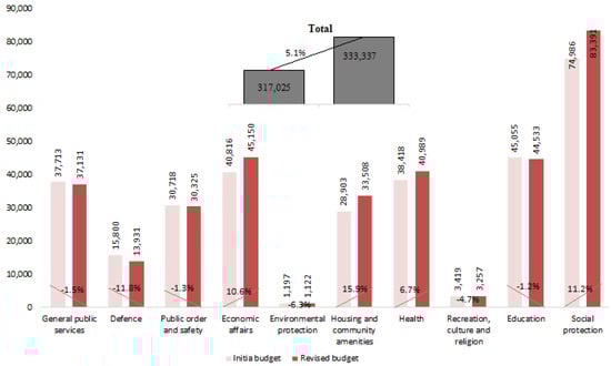 Regarding the situation created after the budget review in 2020, as presented in Figure 3, it is noted that there was an increase in total expenditures for budgetary institutions of 5.1% while total expenditures increased by 5.5%. The restructuring was carried out by giving priority to functions that were more directly related to the effects caused by COVID-19. More specifically, the restructuring was accompanied by an increase of 15.9% on housing, 11.2% on social protection expenditures and 10.6% on economic issues, while there was a reduction in defense spending of 11.8% or even in environmental issues of 6.3%.
